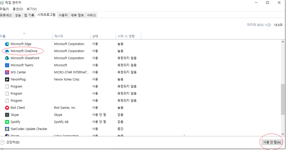 - 작업 관리자 → 시작 프로그램 탭 → 사용하지 않는 프로그램 '사용 안 함'으로 설정.